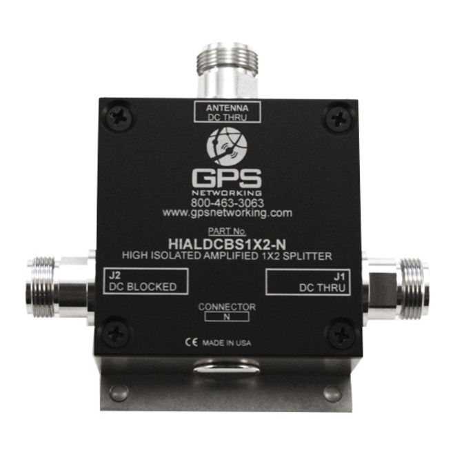 This Amplified Loaded DC Blocked Splitter 1X2 (ALDCBS1X2) is an active one input, two output splitter that splits signals from 1.1 GHz to 1.7 GHz. This equipment is designed to amplify and split signals within the L-band to provide two devices with the signal from a single antenna. In the standard configuration, the J1 port will pass DC voltage from a connected device and pass this power to the antenna or other devices upline from the splitter via the antenna port. The other port (J2) is DC blocked and loaded with a 200Ω resistor to simulate antenna current draw which prevents antenna alarm faults. Custom gain, DC power, and connector configurations are available upon request.