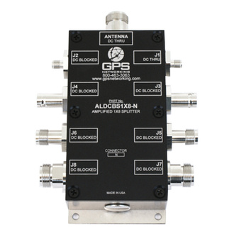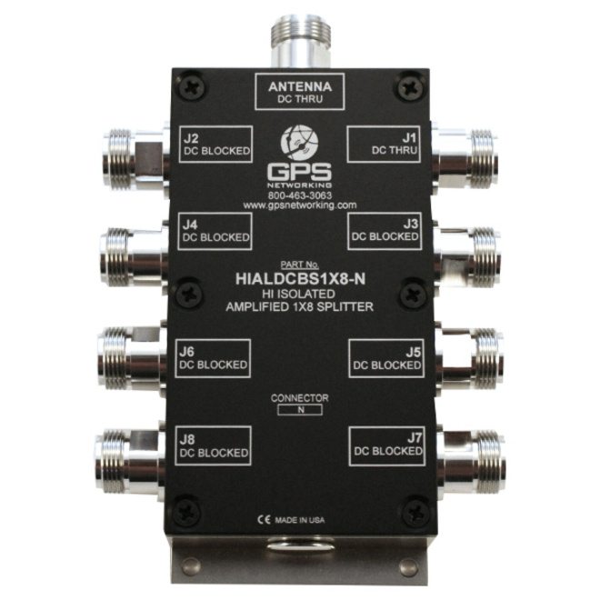 The ALDCBS1X8 GPS Amplified Splitter is a one input, eight output device based on the Wilkinson splitter design. The frequency response covers the entire L-band (all GNSS frequencies) with excellent gain flatness. In the standard configuration without external power, Output 1 (J1) passes DC from the connected GPS device through the splitter to the input (antenna port), allowing the GPS receiver to power both an active antenna and the splitter’s internal amplifier. The other RF outputs (J2-J8) are DC blocked and loaded with 200Ω resistors to simulate the antenna current draw to prevent false antenna alarm faults.