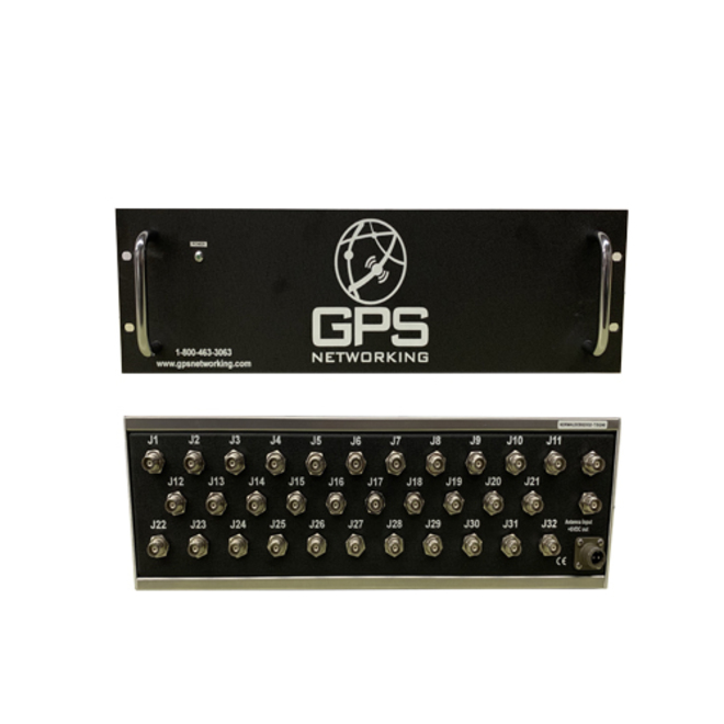 The DRMALDCBS2X32 GPS Rack Mount Amplified Splitter is a TWO input, thirty-two output device with –2dB max signal loss. The frequency response covers the GPS L1 & L2 bands with excellent gain flatness. In the normal configuration, the splitter is powered by a transformer that supplies power to the splitter’s amplifier and roof antenna. The outputs are DC loaded with a 200Ω resistor to simulate the antenna current draw. This product is ideally suited for timing and testing applications where the GPS carrier signal is required by up to 32 GPS devices simultaneously.