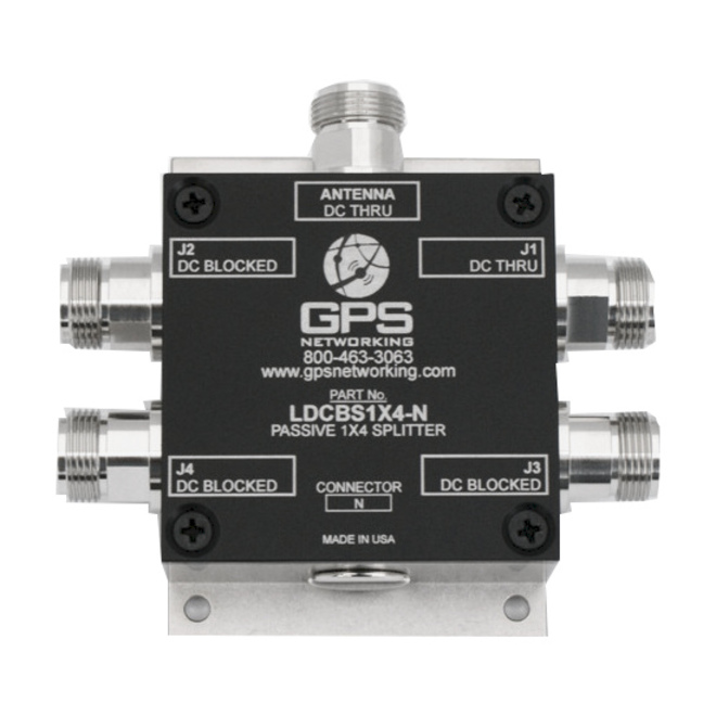 This Loaded DC Blocked Splitter 1X4 (LDCBS1X4) is a passive one input, four output RF splitter that splits signals from 1.1 GHz to 1.7 GHz. This equipment is designed to split signals within the L-band to provide multiple devices with the signal from a single antenna. In the standard configuration, the J1 port will pass DC voltage from a connected device and pass this power to the antenna or other devices upline from the splitter. The other ports (J2-J4 are DC blocked and loaded with 200 resistors to simulate antenna current draw which prevents antenna alarm faults. Custom gain configuration, DC configuration, and connector configuration are available upon request.
