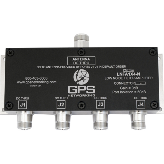 A LNFA1x4 low-noise, filtered, amplified 1x4 GPS antenna splitter.