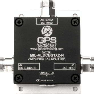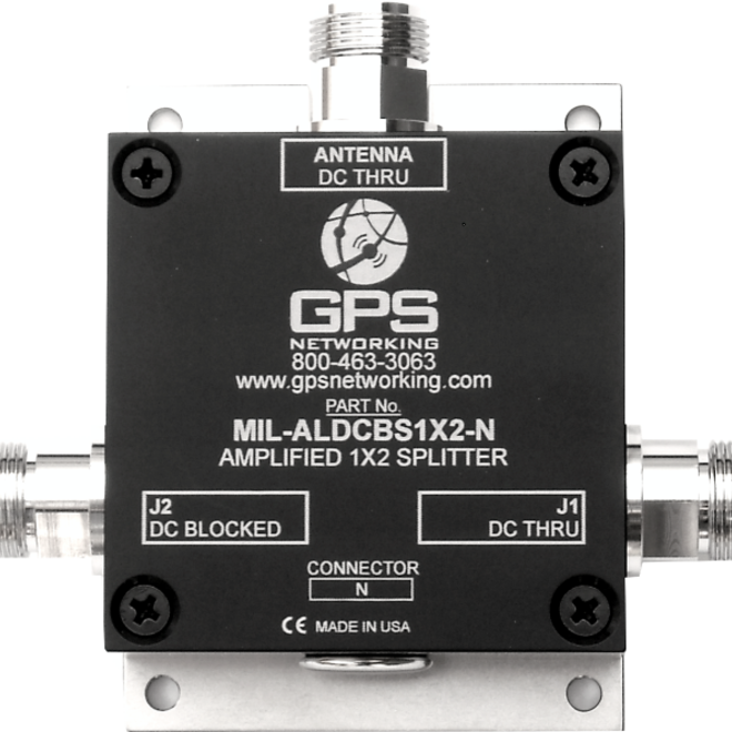 This Military Qualified Amplified Loaded DC Blocked Splitter 1X2 (MIL-ALDCBS1X2) is an active one input, two output RF splitter that splits signals from 1.1 GHz to 1.7 GHz. This equipment is designed to amplify and split signals within the L-band to provide multiple devices with the signal from a single antenna. In the standard configuration, the J1 port will pass DC voltage from a connected device and pass this power to the antenna or other devices upline from the splitter via the antenna port. The other port (J2) is DC blocked and loaded with a 200Ω resistor to simulate antenna current draw which prevents antenna alarm faults. All MIL-Spec splitters are qualified to the rigorous MIL-STD 810F environmental & MIL-STD-461F EMI standards. Custom gain, DC power, and connector configuration are available upon request.