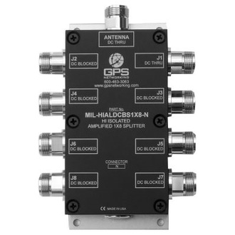 This Military Qualified High Isolated, Amplified, Loaded, DC Blocked, Splitter 1X8 (MIL-HIALDCBS1X8) is an active one input, eight output RF splitter that splits signals from 1.1 GHz to 1.7 GHz. This equipment is designed to amplify and split signals within the L-band to provide multiple devices with the signal from a single antenna. Each output port (J1-J8) is isolated from external signals to prevent interference. In the standard configuration, the J1 port will pass DC voltage from a connected device and pass this power to the antenna or other devices upline from the splitter via the antenna port. The other ports (J2-J8) are DC blocked and loaded with 200Ω resistors to simulate antenna current draw which prevents antenna alarm faults. All MIL-Spec splitters are qualified to the rigorous MIL-STD 810F environmental & MIL-STD-461F EMI standards. Custom gain, DC, and connector configurations available on request.