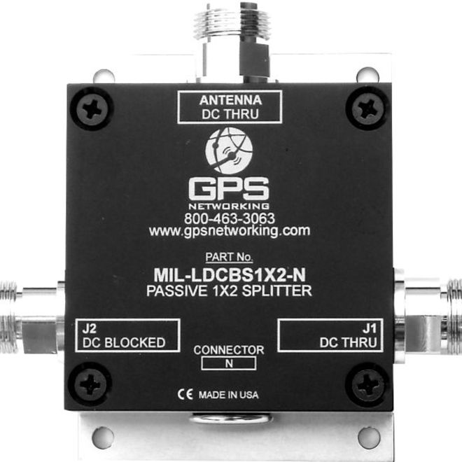 This Military Qualified Loaded DC Blocked Splitter 1X2 (MIL-LDCBS1X2) is a passive one input, two output RF splitter that splits signals from 1.1 GHz to 1.7 GHz. This equipment is designed to passively split signals within the L-band to provide multiple devices with the signal from a single antenna. In the standard configuration, the J1 port will pass DC voltage from a connected device and pass this power to the antenna or other devices upline from the splitter. The other port (J2) is DC blocked and loaded with 200Ω resistors to simulate antenna current draw which prevents antenna alarm faults. All MIL-Spec splitters are qualified to the rigorous MIL-STD 810F environmental & MIL-STD-461F EMI standards. Custom gain, DC power, and connector configurations are available upon request.