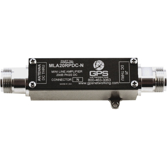 This Mini Line Amplifier 20dB Regulated Pass DC (MLA20RPDC) is an active one input, one output amplifier optimized for GPS applications. This equipment accepts signals covering all major GNSS constellations with excellent gain flatness and a low L1 noise figure. In the standard configuration, the J1 port accepts DC voltage from a connected GPS receiver. This voltage is regulated and used to power the internal amplifiers while unregulated voltage is passed through the antenna port to power a connected active antenna or other upstream devices.