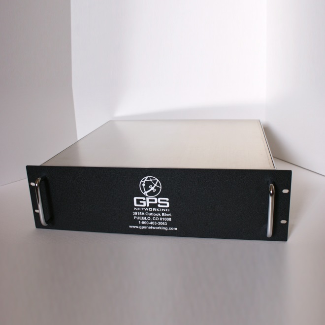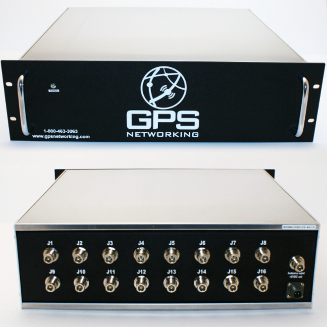 A front view of a RMALDCBS1x16 Rack Mount Amplified GPS Splitter