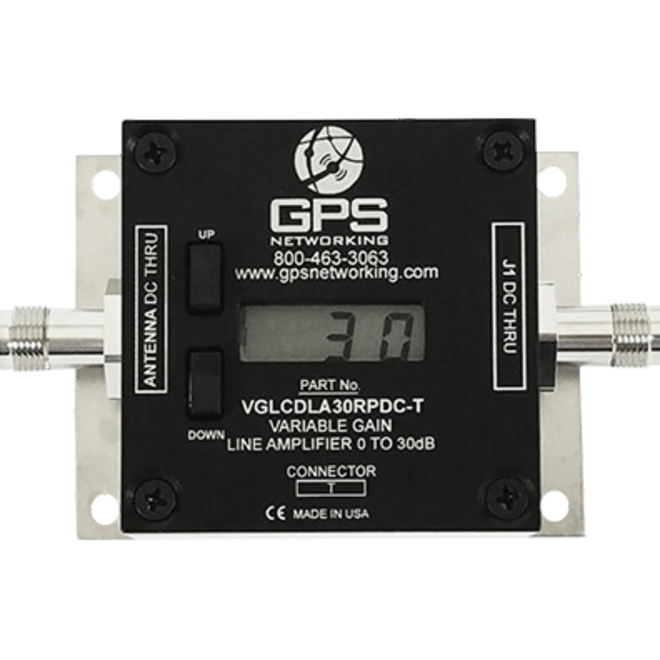 This Variable Gain with LCD screen Line Amplifier 30dB Regulated Pass DC (VGLCDLA30RPDC) is an active one input, one output amplifier optimized for GPS applications. This amplifier will amplify the provided signal from 0 to 30 dB and can be changed using the LCD and the control buttons to the side. This equipment accepts signals covering all major GNSS constellations with excellent gain flatness. In the standard configuration, the J1 port accepts DC voltage from a connected GPS receiver. This voltage is regulated and used to power the internal amplifiers and screen while unregulated voltage is passed through the antenna port to power a connected active antenna or other upstream devices.In the Networked (Externally Powered) configuration, the output (J1) is DC Blocked, and a customer-defined output voltage is provided via the antenna port. Custom gain, DC power, and connector configurations are available upon request.